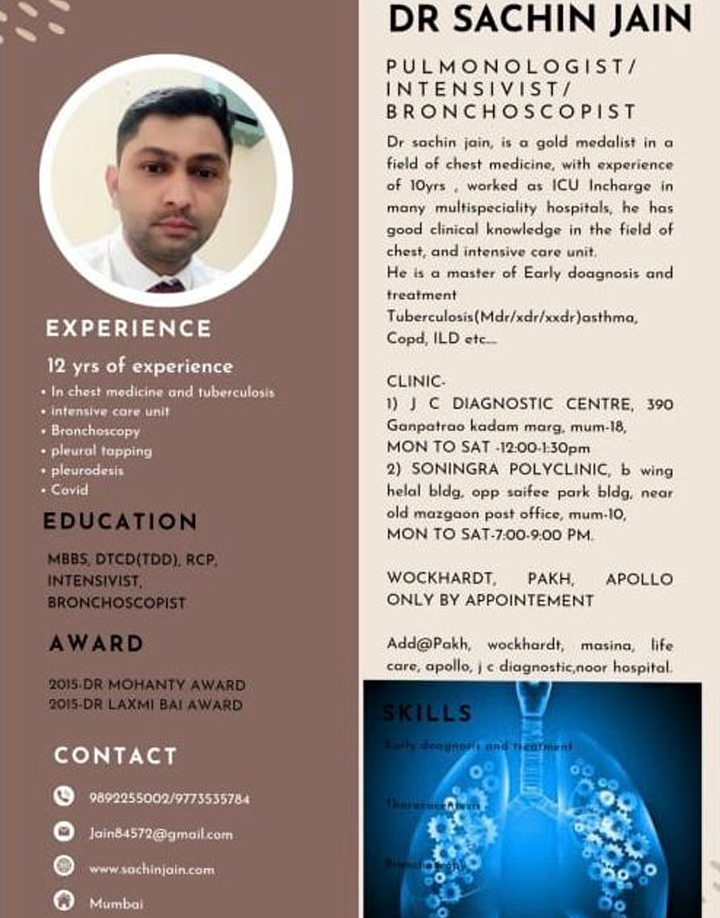 Dr.Sachin Jain is best chest physician in Byculla and Wroli area. He is having depth knowledge in his field.